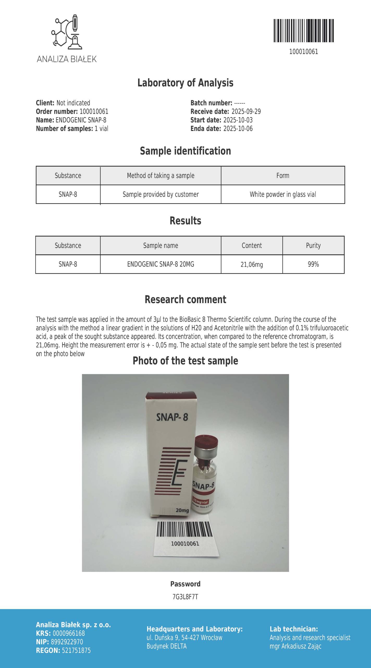 SNAP-8 is an innovative cosmetic peptide developed to combat facial wrinkles. It is an octapeptide that works by reducing muscle tension. As a result, the skin becomes smoother and more elastic, and wrinkles become less visible. SNAP is a biomimetic peptide with lifting and skin-tightening properties. It is a synthetic analog of the SNAP-25 protein, which is responsible for transmitting nerve impulses to mimic muscles. SNAP blocks this process and prevents excessive muscle contraction, reducing the visibility of wrinkles.
