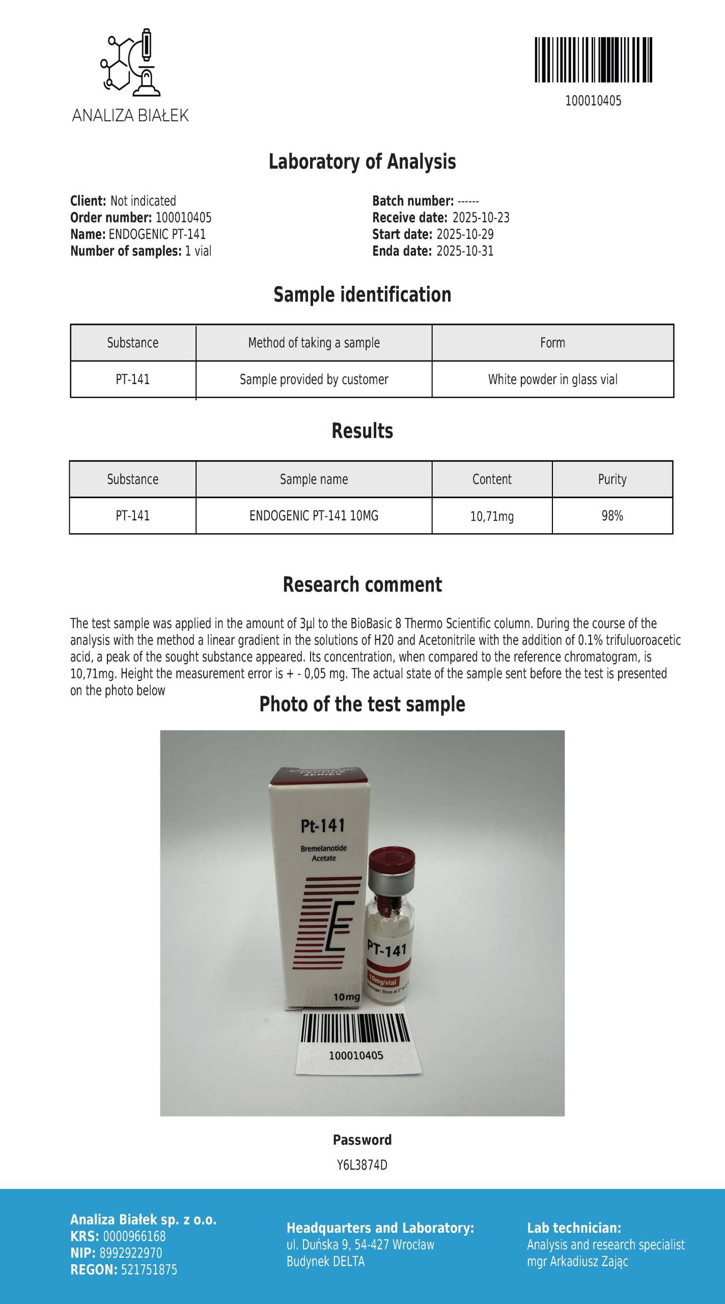 The peptide is used as part of the treatment for libido and erectile disorders. Even a single dose has a strong immediate effect and improves sexual experiences. Libido is a complex aspect of our bodies, and it is not solely related to the hormonal system. Our emotional feelings, stress, and fatigue can effectively reduce our sexual desire. In today’s fast-paced life, with a multitude of responsibilities and chronic stress, our sexual capabilities can be significantly limited. PT-141 allows us to unlock our desires, alleviate stress-induced feelings, and stimulate the desire for intercourse. By using this peptide, you can revive your sex life and give it new colors!